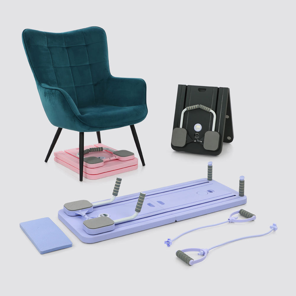 המארז כולל את מכשיר הפילאטיקס, 2 רצועות התנגדות, רפידת תמיכה לברכיים, 2 מוטות תמיכה לגיוון התרגילים, והדרכה דיגיטלית מלאה על המכשיר.